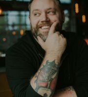 A multi-story building with a slightly aged facade. The middle floor has a window with a warm light illuminating the interior, suggesting someone is home. A sign is displayed on the balcony above, indicating the property might be for rent or sale. The building is situated on a narrow street between similar structures with visible street signage.